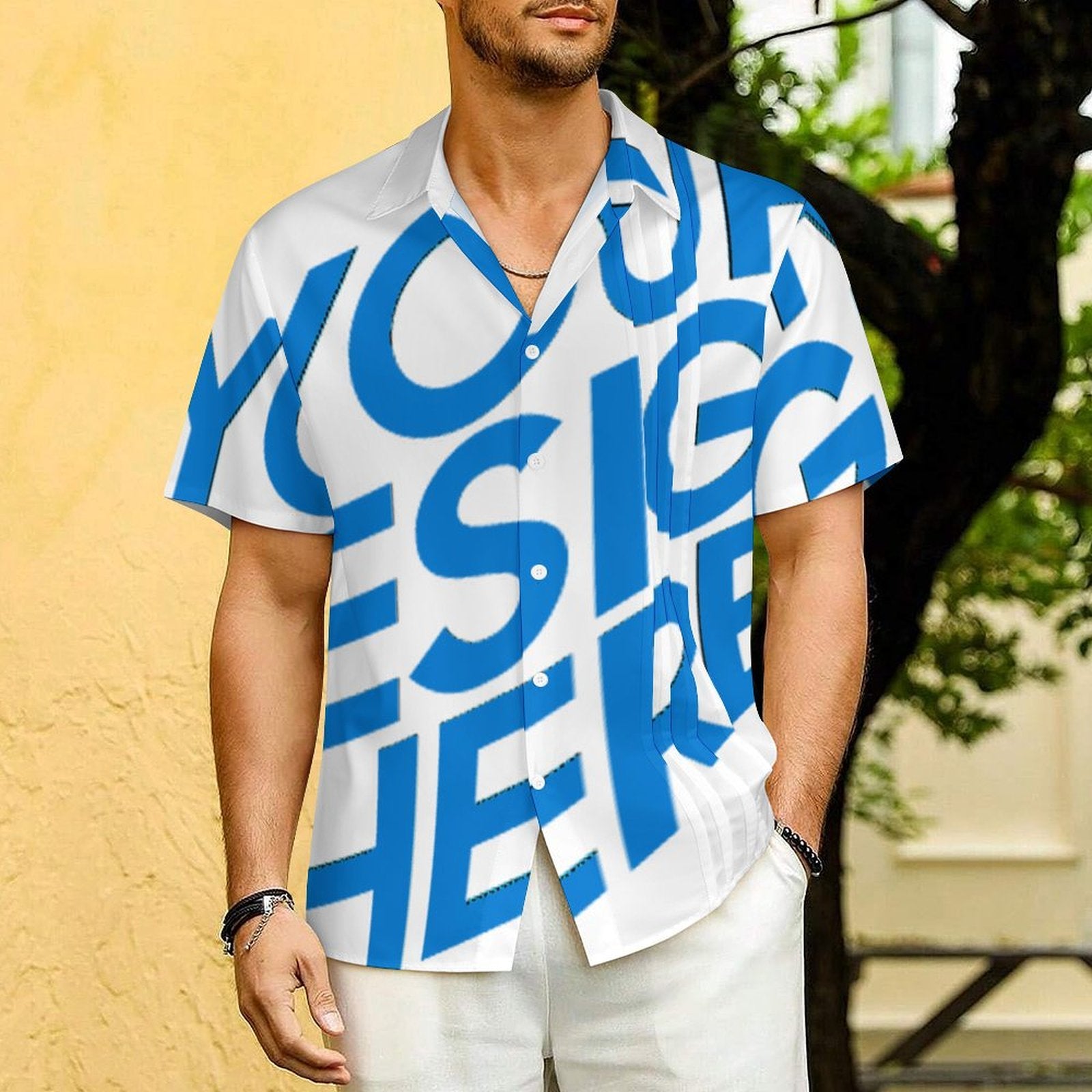 Einzelbild-Design Herren Kurzarmhemd mit Revers und Falten mit Ihrem Design Motiv Foto Text selbst gestalten und bedrucken, besteht aus weicher Polyester steht für ultimativen Tragekomfort. Wenn ein Hemd einmal richtig passt, dann will es der Herr gleich in mehreren Varianten. Und vor allem bei sommerlichen Temperaturen sehnt man sich nach einer Kurzarm-Option. Kurzarmhemd weiß, wie es geht. Es zeigt sich modisch gestreift und in geradem Schnitt mit bequemen Rückenfalten. Das Design ist klassisch gehalte.