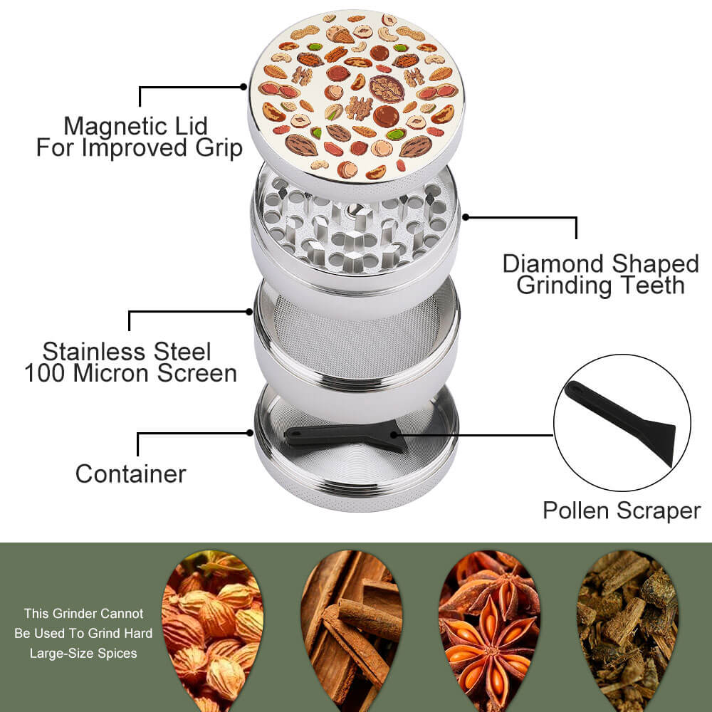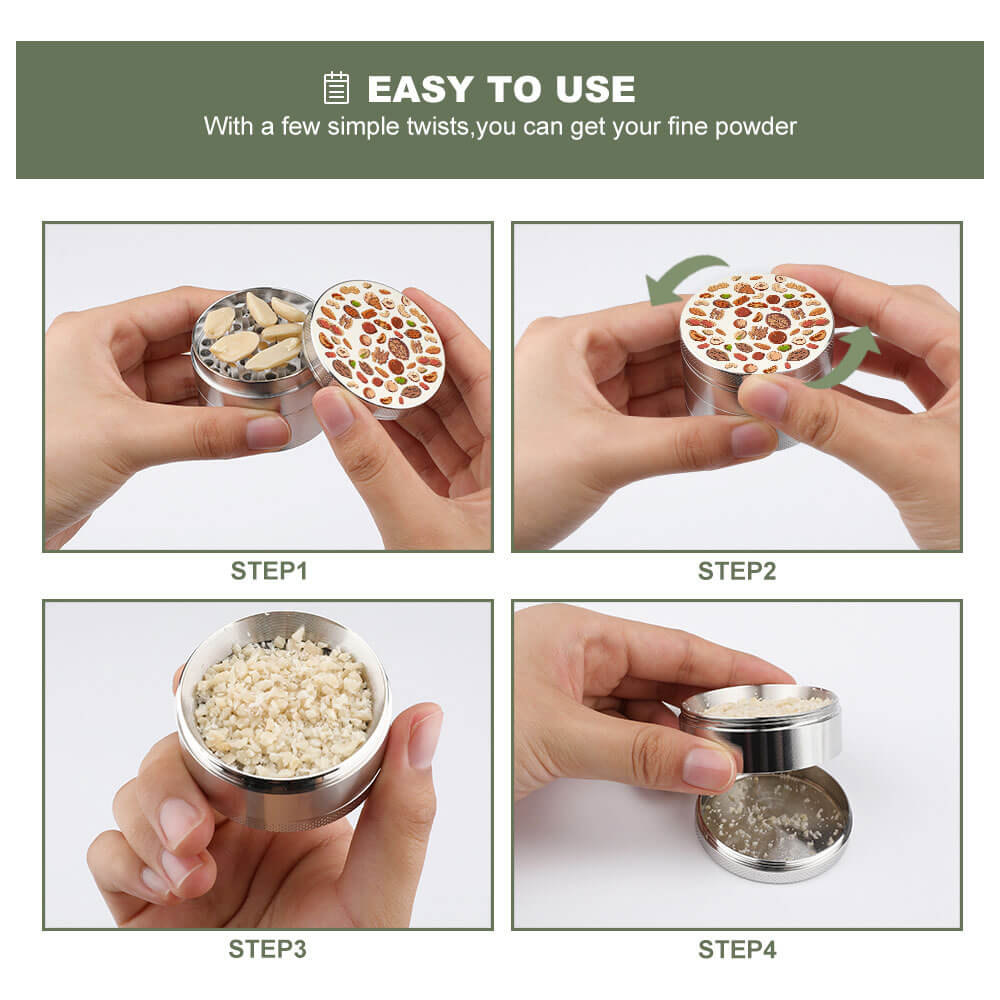Diese exquisite und kompakte Mühle ist aus hochwertigem Metall gefertigt, fühlt sich glatt an, läuft reibungslos, lässt sich leicht öffnen und schließen und ist langlebig. Antihaftbeschichtete Spezialmaterialien sorgen für ein intelligenteres Bedienerlebnis. Das rautenförmige Zahndesign ist schärfer und glatter. Die Mühle ist effektiv und bequem, um schnell zu mahlen. 4 Stück mit 3 Fächern mit Pollenfallen können Ihnen helfen, kleinere Fragmente und feine Pulverpartikel vom Boden zu entfernen. Drehen Sie einfach die obere Kappe leicht, und die scharfen Zähne schleifen gut und die Spitze wird nicht auslaufen. Er eignet sich zum Mahlen von Pfeffer, getrocknetem Chili, Nelken, Senf, Fenchel, Koriander, Meersalz usw. Durch das leichte und kompakte Design passt er gut in die Schrankschublade und ist bequem zu tragen.