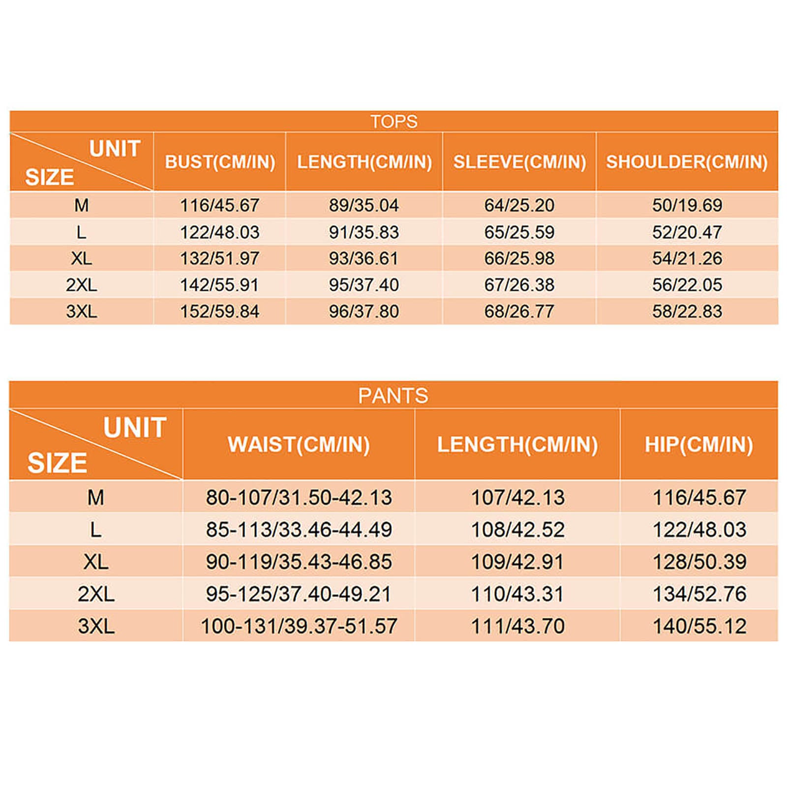 | 3XL | 152/59.84 | 96/37.80 | 68/26.77 | 58/22.83 | 100-131/39.37-51.57 | 111/43.70 | 140/55.12 |