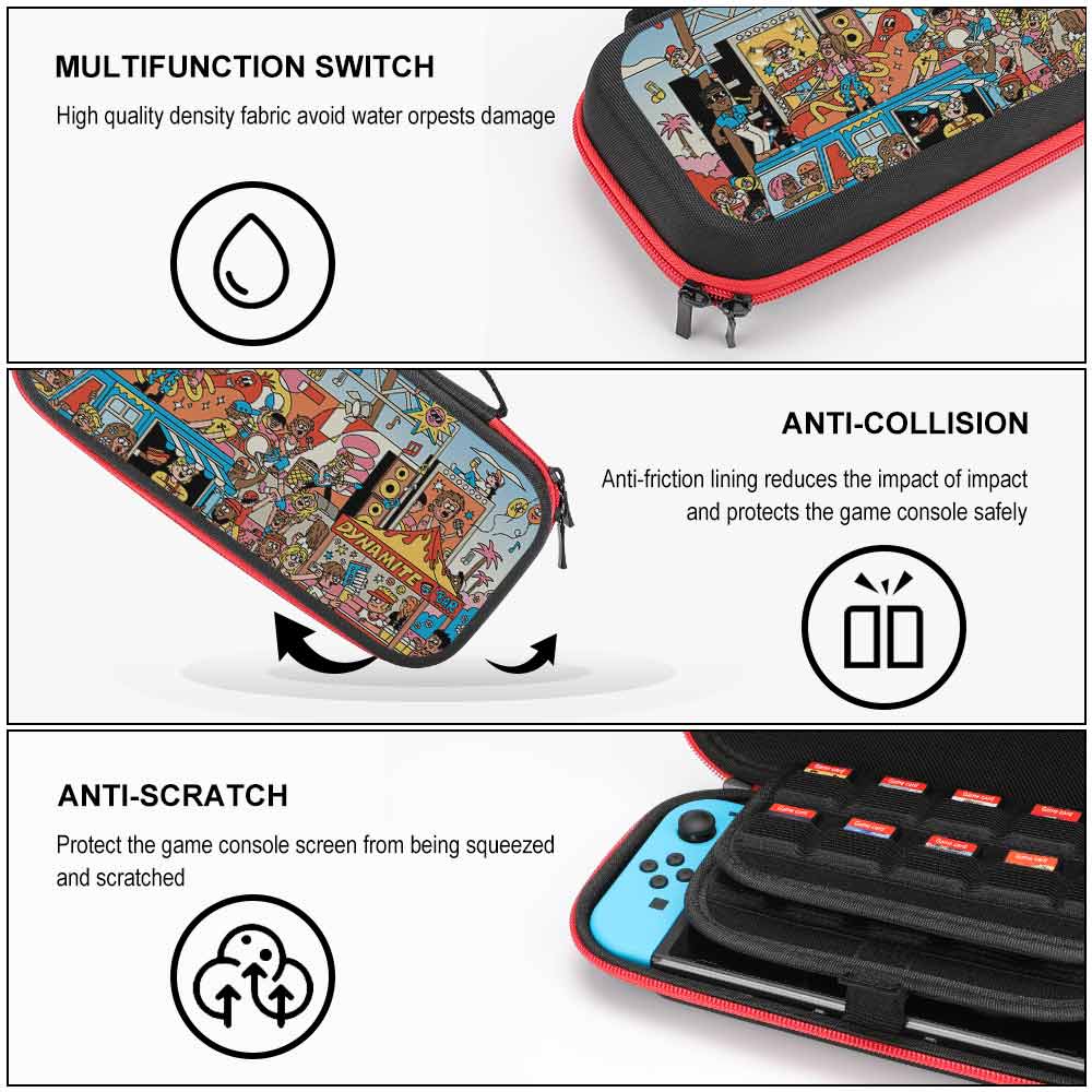 Diese Aufbewahrungstasche für die Spielkonsole Nintendo Switch bietet Platz für Ihre Switch-Spielkonsole, Joycon und Spielkarte, Headset, Ladekabel und anderes kleines Switch-Zubehör. Die innere Netztasche hat einen Reißverschluss, um das Herunterfallen von Zubehör zu verhindern. Die Aufbewahrungstasche hat 20 Spielkartenfächer, die zur Innenseite der Aufbewahrungstasche zeigen, so dass es nicht leicht ist, die Karten beim Tragen zu verlieren. Die Schale besteht aus hartem EVA, das wasserdicht, staubdicht, verschleißfest und stark ist, die Innenseite aus Samtmaterial, das die Sicherheit der Spielekonsole im Falle eines Sturzes effektiv schützen kann. Die Aufbewahrungstasche ist für Switch-Spielekonsolen geeignet und mit einem komfortablen, rutschfesten Trageriemen zum bequemen Tragen ausgestattet – ein Must-Have für unterwegs.