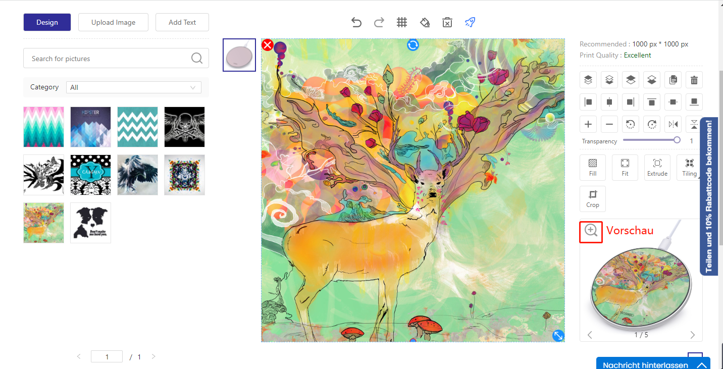 : Sie können die Bilder lokal vom Computer hochladen und direkt verwenden. Sie können die Bilder direkt für das Designer hochladen. Das Hochladen mehrerer Bilder und das mehrschichtige Design sind möglich.